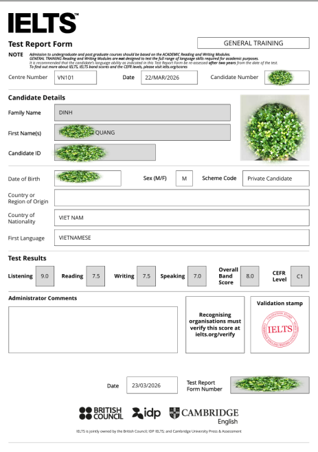 Quang sửa đúng bốn điều này — cộng với giữ lại đoạn cảm xúc từ R2 và chi tiết cụ thể từ R1 — và đạt Writing 7.5 trong bài thi thật. Overall 8.0.